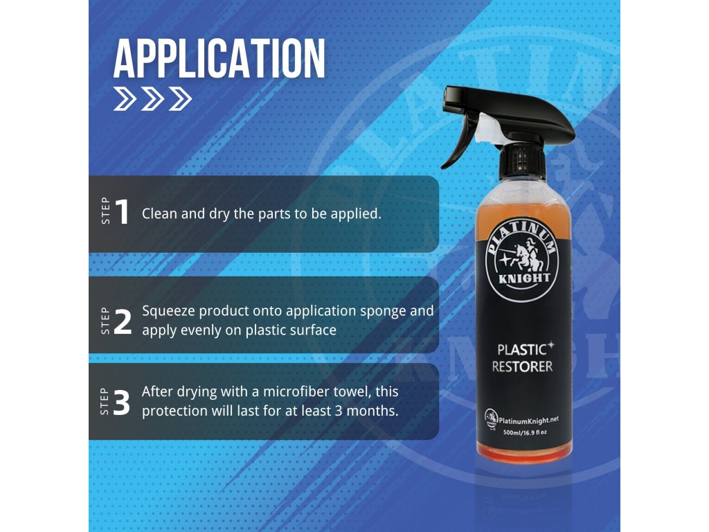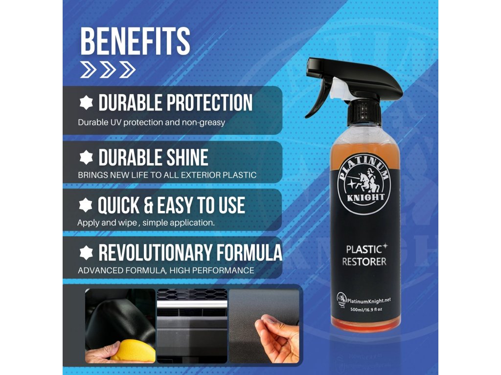 Za několik minut oživí vybledlé a zašlé plasty a gumu na náraznících, lištách, těsněních oken a dalších exteriérových prvcích. PLATINUM KNIGHT